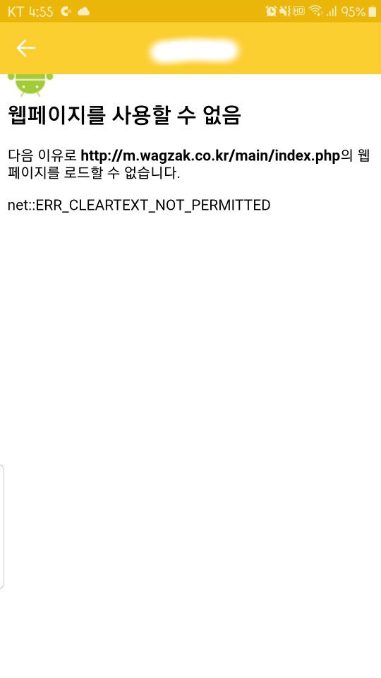 안드로이드 웹뷰에서 'https://blrablra' 형태의 url이 http로 이동되어, https 만 이동 가능한 안드로이드 OS 9 이상 버전의 기기에서 흰 페이지와 함께 'ERR_CLEARTEXT_NOT_PERMITTED' 가 발생하는 에러입니다.
