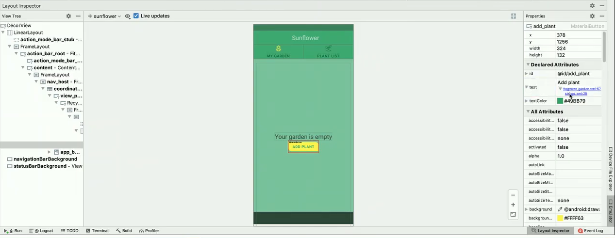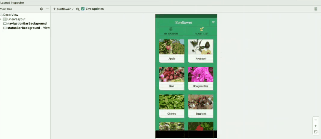 Layout Inspector를 통해 레이아웃의 세부정보를 볼 수 있고, 원하는 요소를 클릭해서 '세부사항'ex)색상 데이터가 어디서 유래한 건지 알 수 있습니다.