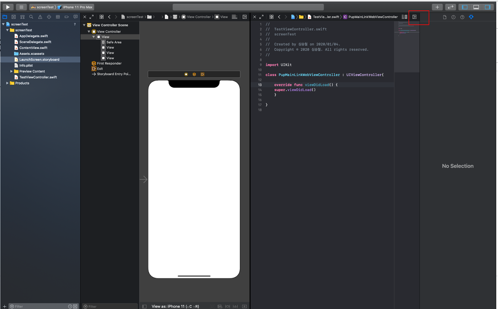 Xcode의 ‘Add Editor On Right’ 버튼을 클릭해 화면을 여러 개로 나누어 스토리보드, swift 파일을 동시에 볼 수 있습니다.